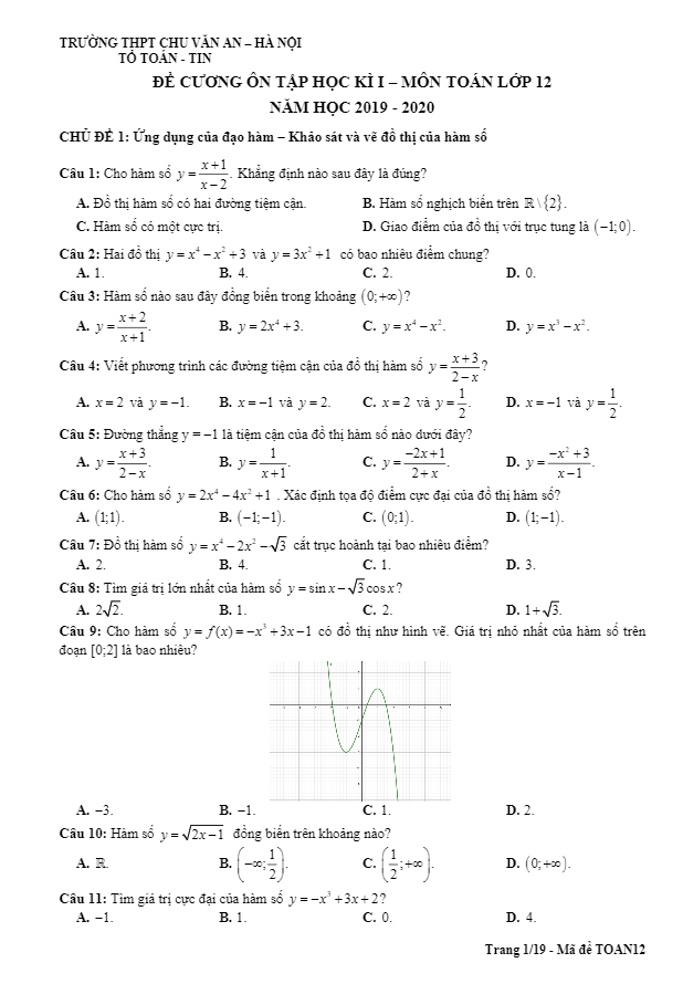Đề cương ôn tập HK1 Toán 12 năm 2019 – 2020 trường Chu Văn An – Hà Nội