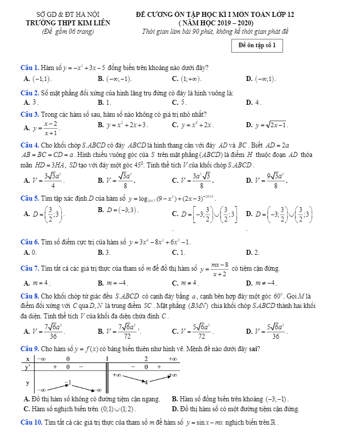 Đề cương ôn tập học kì 1 Toán 12 năm 2019 – 2020 trường Kim Liên – Hà Nội
