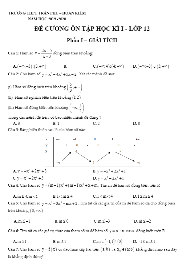 Đề cương ôn tập Toán 12 HKI năm 2019 – 2020 trường THPT Trần Phú – Hà Nội