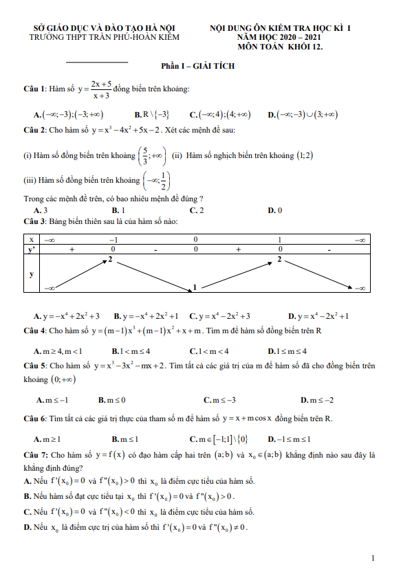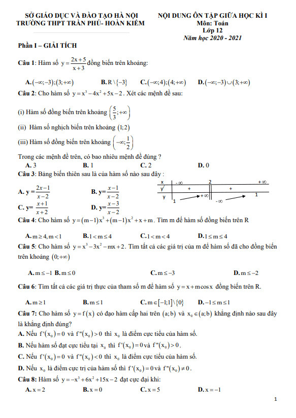 Nội dung ôn tập giữa HK1 Toán 12 năm 2020 – 2021 trường THPT Trần Phú – Hà Nội