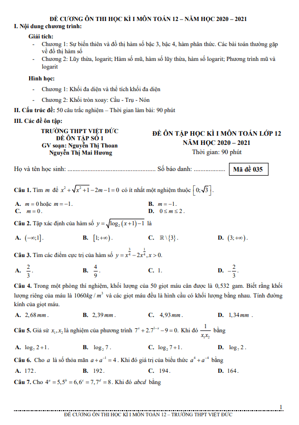 Đề cương ôn thi học kì 1 Toán 12 năm 2020 – 2021 trường THPT Việt Đức – Hà Nội