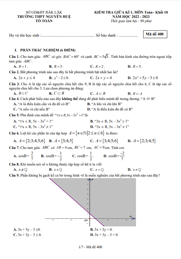 Đề giữa học kì 1 Toán 10 năm 2022 – 2023 trường THPT Nguyễn Huệ – Đắk Lắk