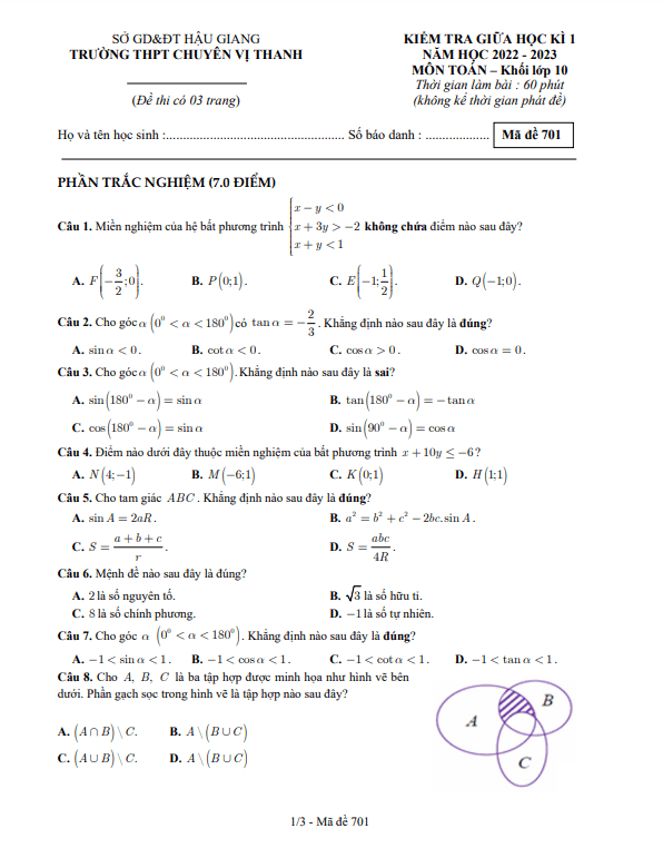 Đề giữa kì 1 Toán 10 năm 2022 – 2023 trường chuyên Vị Thanh – Hậu Giang