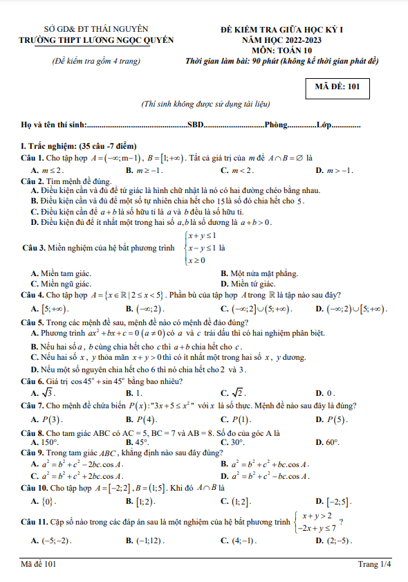 Đề giữa kỳ 1 Toán 10 năm 2022 – 2023 THPT Lương Ngọc Quyến – Thái Nguyên
