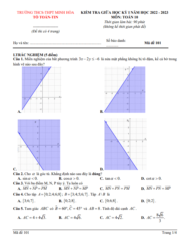 Đề giữa kỳ 1 Toán 10 năm 2022 – 2023 trường THCS & THPT Minh Hòa – Bình Dương