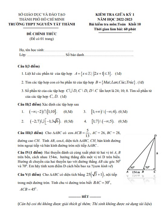 Đề giữa kỳ 1 Toán 10 năm 2022 – 2023 trường THPT Nguyễn Tất Thành – TP HCM