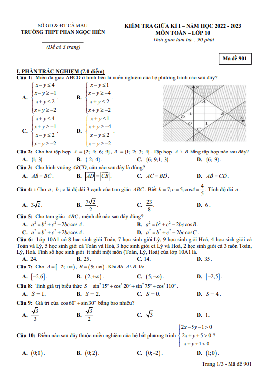 Đề giữa kỳ 1 Toán 10 năm 2022 – 2023 trường THPT Phan Ngọc Hiển – Cà Mau
