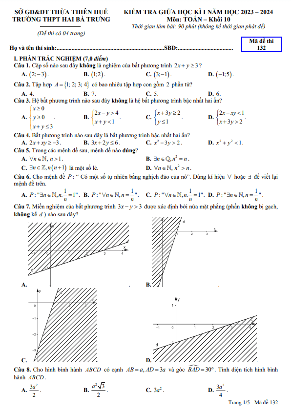 Đề giữa học kì 1 Toán 10 năm 2023 – 2024 trường THPT Hai Bà Trưng – TT Huế