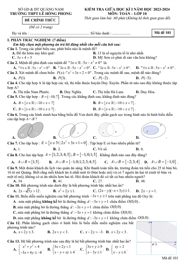 Đề giữa học kì 1 Toán 10 năm 2023 – 2024 trường THPT Lê Hồng Phong – Quảng Nam