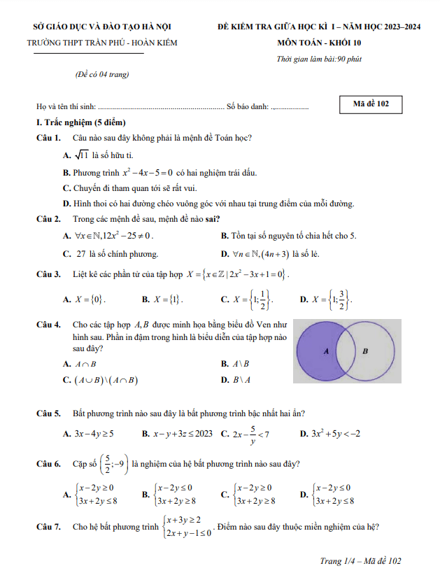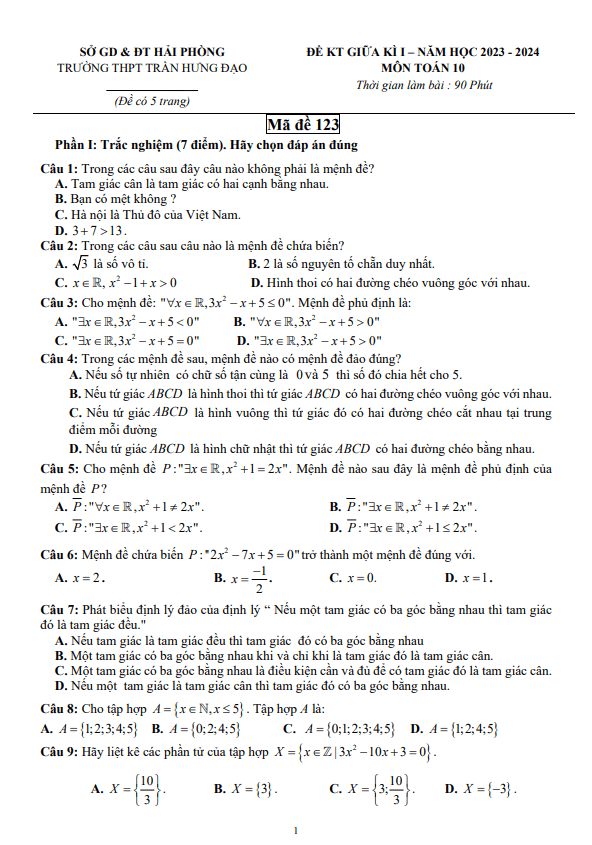 Đề giữa kỳ 1 Toán 10 năm 2023 – 2024 trường THPT Trần Hưng Đạo – Hải Phòng