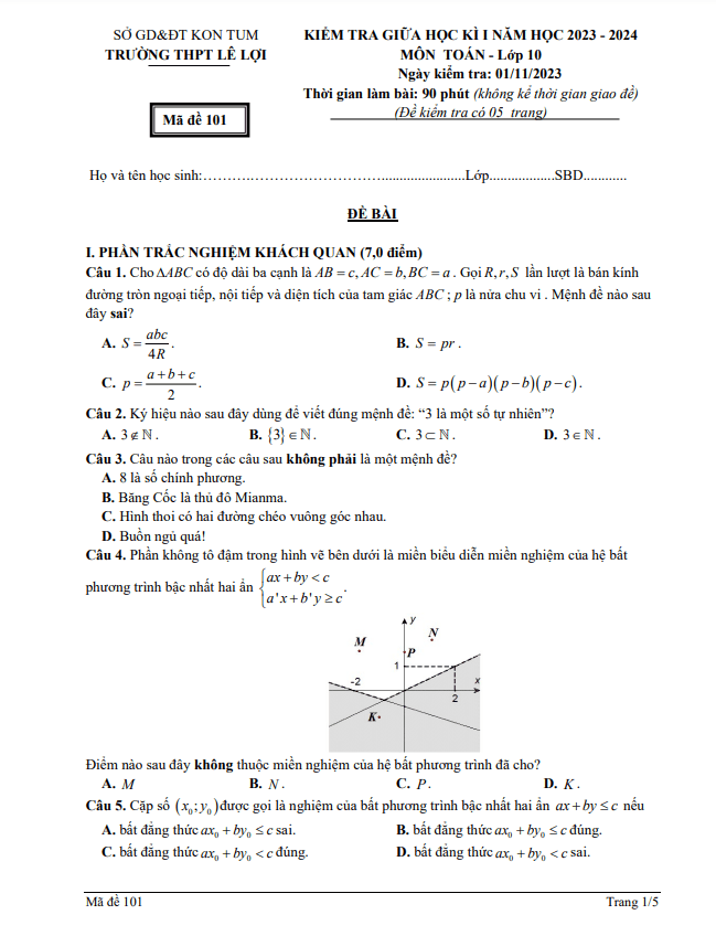Đề giữa học kỳ 1 Toán 10 năm 2023 – 2024 trường THPT Lê Lợi – Kon Tum