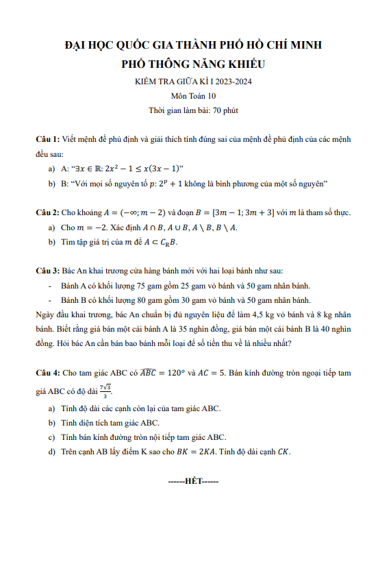 Đề giữa kì 1 Toán 10 năm 2023 – 2024 trường Phổ thông Năng khiếu – TP HCM