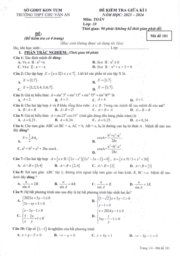 Đề giữa kì 1 Toán 10 năm 2023 – 2024 trường THPT Chu Văn An – Kon Tum