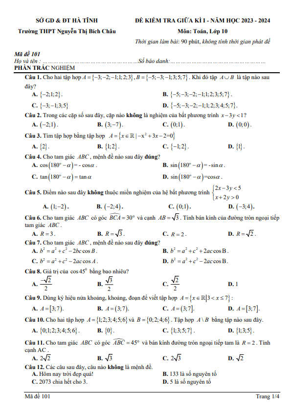 Đề giữa kì 1 Toán 10 năm 2023 – 2024 trường THPT Nguyễn Thị Bích Châu – Hà Tĩnh