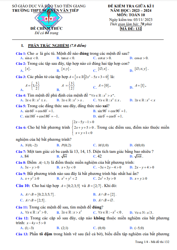 Đề giữa kì 1 Toán 10 năm 2023 – 2024 trường THPT Nguyễn Văn Tiếp – Tiền Giang