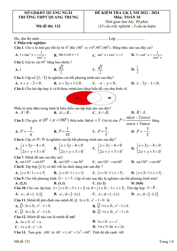 Đề giữa kỳ 1 Toán 10 năm 2023 – 2024 trường THPT Quang Trung – Quảng Ngãi