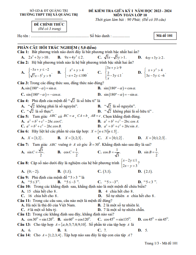 Đề giữa kỳ 1 Toán 10 năm 2023 – 2024 trường THPT Thị xã Quảng Trị