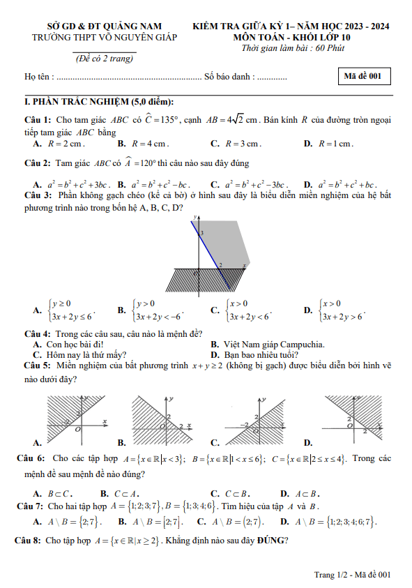 Đề giữa kỳ 1 Toán 10 năm 2023 – 2024 trường THPT Võ Nguyên Giáp – Quảng Nam