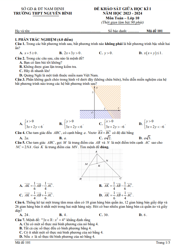 Đề giữa học kì 1 Toán 10 năm 2023 – 2024 trường THPT Nguyễn Bính – Nam Định
