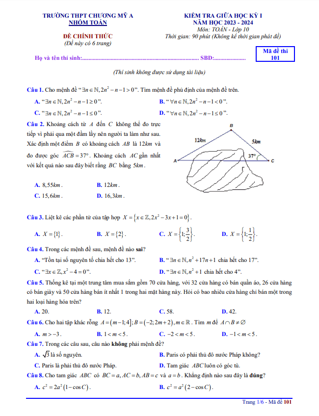 Đề giữa học kỳ 1 Toán 10 năm 2023 – 2024 trường THPT Chương Mỹ A – Hà Nội