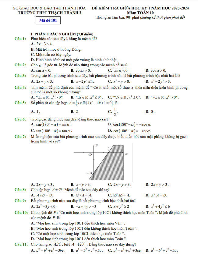 Đề giữa học kỳ 1 Toán 10 năm 2023 – 2024 trường THPT Thạch Thành 2 – Thanh Hóa