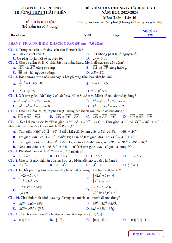 Đề giữa học kỳ 1 Toán 10 năm 2023 – 2024 trường THPT Thái Phiên – Hải Phòng