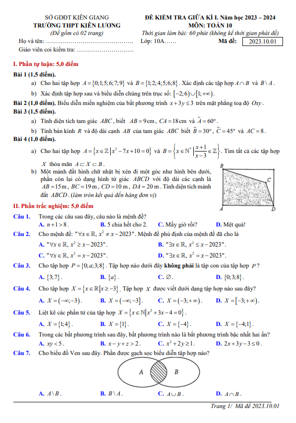 Đề giữa kì 1 Toán 10 năm 2023 – 2024 trường THPT Kiên Lương – Kiên Giang
