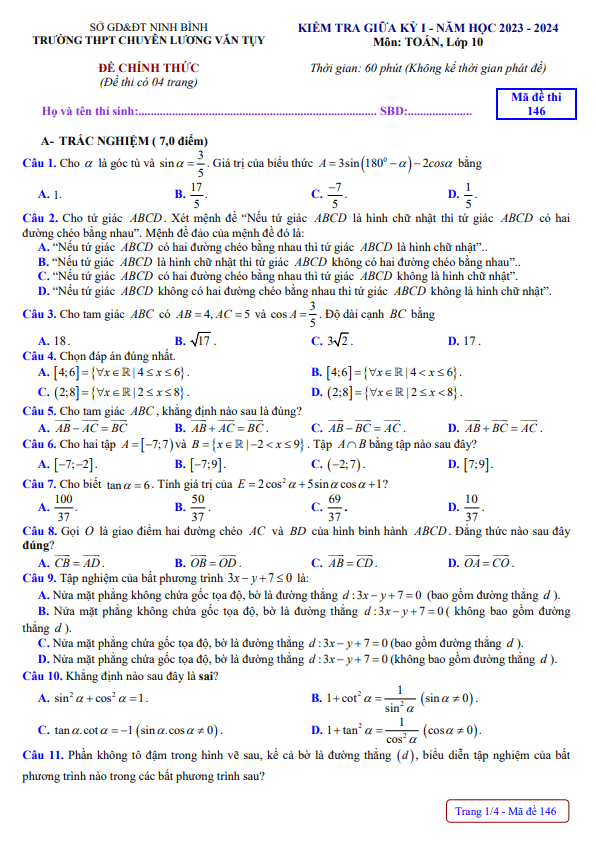 Đề giữa kỳ 1 Toán 10 năm 2023 – 2024 trường chuyên Lương Văn Tụy – Ninh Bình