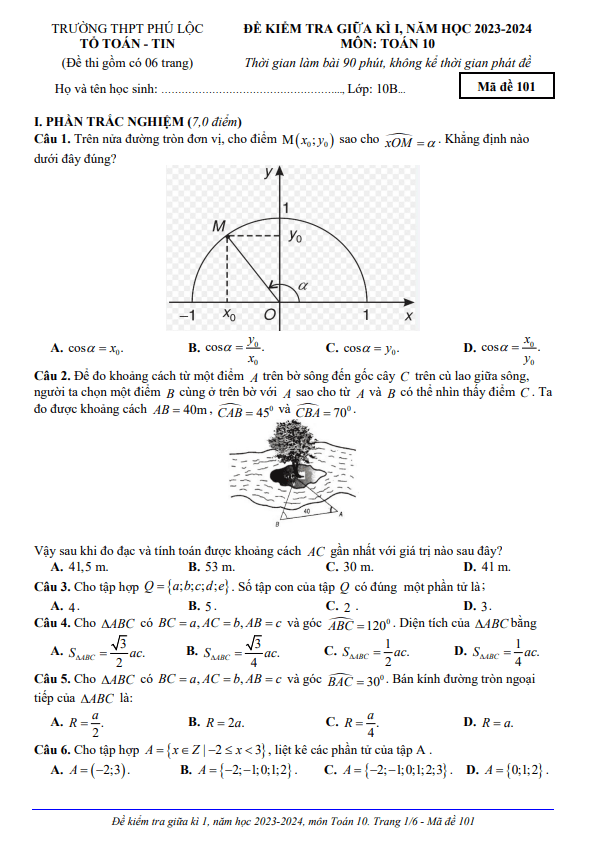 Đề giữa kỳ 1 Toán 10 năm 2023 – 2024 trường THPT Phú Lộc – TT Huế