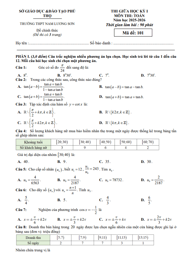 Đề giữa học kỳ 1 Toán 11 năm 2025 – 2026 trường THPT Nam Lương Sơn – Phú Thọ