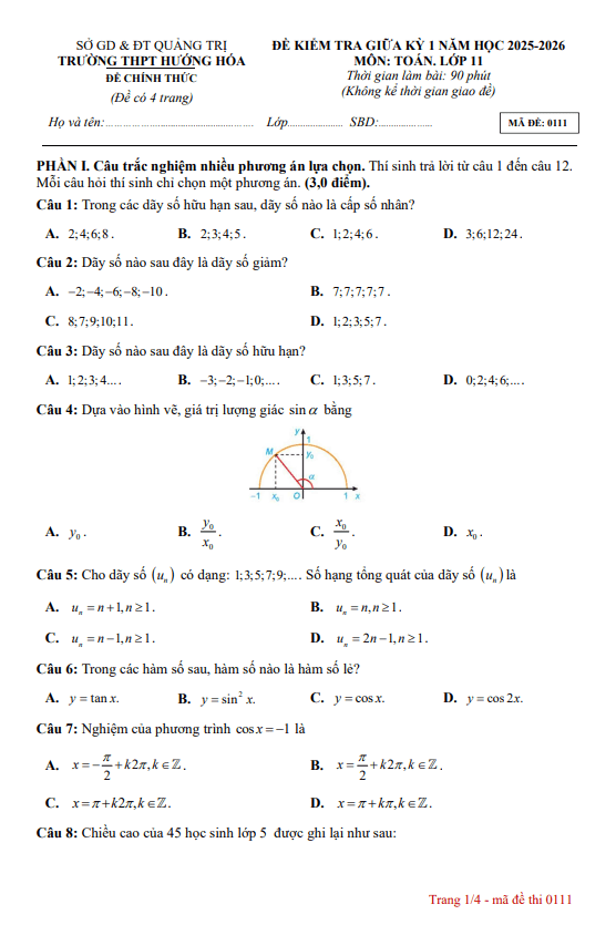 Đề giữa kỳ 1 Toán 11 năm 2025 – 2026 trường THPT Hướng Hóa – Quảng Trị