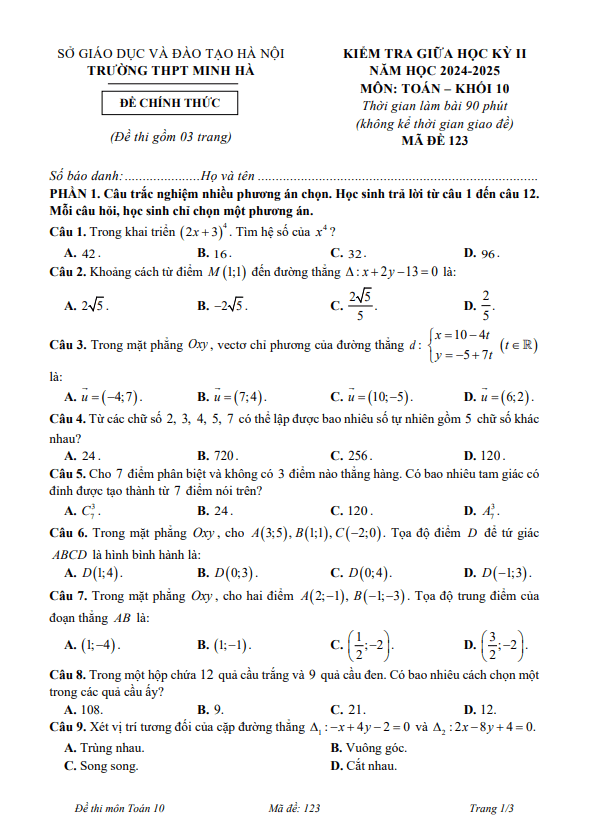 Đề giữa học kì 2 Toán 10 năm 2024 – 2025 trường THPT Minh Hà – Hà Nội