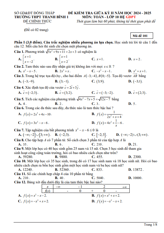 Đề giữa kỳ 2 Toán 10 năm 2024 – 2025 trường THPT Thanh Bình 1 – Đồng Tháp