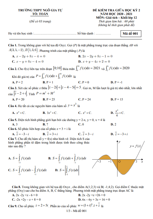 Đề thi giữa kỳ 2 Toán 12 năm 2020 – 2021 trường Nguyễn Tất Thành – Hà Nội