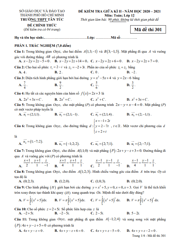 Đề thi giữa kì 2 Toán 12 năm 2020 – 2021 trường THPT Tân Túc – TP HCM