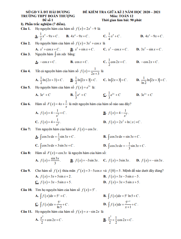 Đề thi giữa kỳ 2 Toán 12 năm 2020 – 2021 trường Đoàn Thượng – Hải Dương