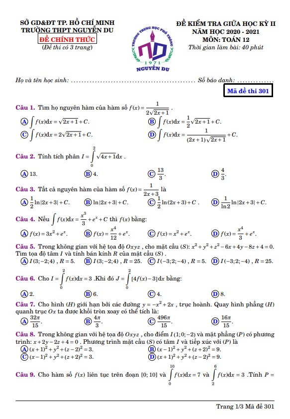 Đề thi giữa kỳ 2 Toán 12 năm 2020 – 2021 trường THPT Nguyễn Du – TP HCM