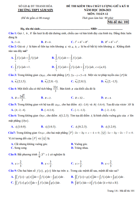 Đề thi giữa kỳ 2 Toán 12 năm 2020 – 2021 trường THPT Sầm Sơn – Thanh Hóa