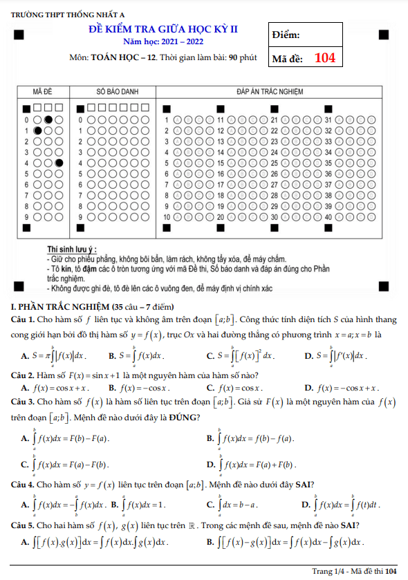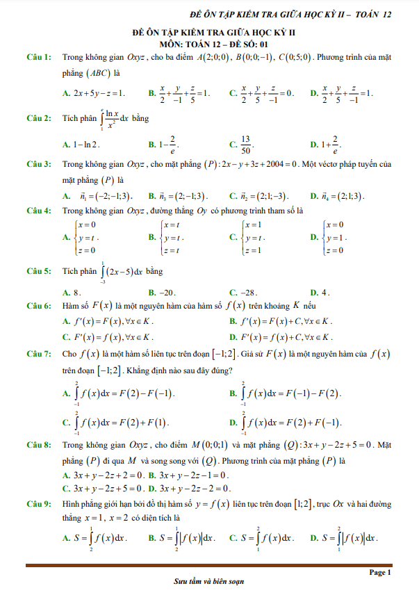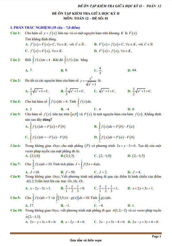 File WORD các ĐỀ THI GIỮA HỌC KÌ 2 TOÁN 12 (nếu có) được đính kèm trong nội dung bài viết, nhằm giúp quý thầy, cô giáo có thể tải xuống miễn phí, phục vụ cho quá trình biên soạn và giảng dạy. Quý thầy, cô giáo và bạn đọc có thể chia sẻ thêm ĐỀ THI GIỮA HỌC KÌ 2 TOÁN 12 bằng cách gửi về địa chỉ email: toanmath.com@gmail.com, nhằm tạo nguồn đề thi phong phú, đa dạng để các em học sinh lớp 12 tham khảo và rèn luyện.