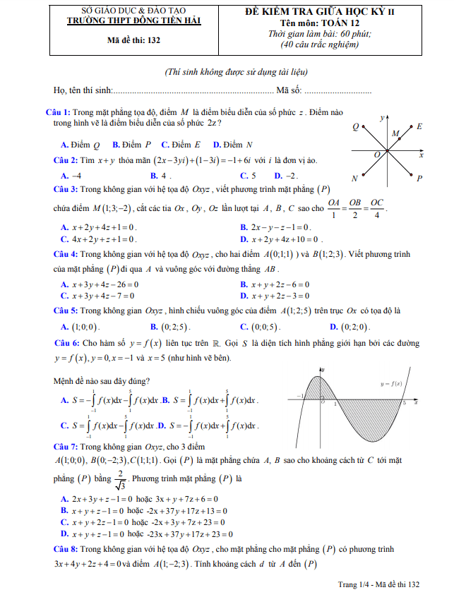 Đề giữa kỳ 2 Toán 12 năm 2021 – 2022 trường THPT Đông Hưng Hà – Thái Bình