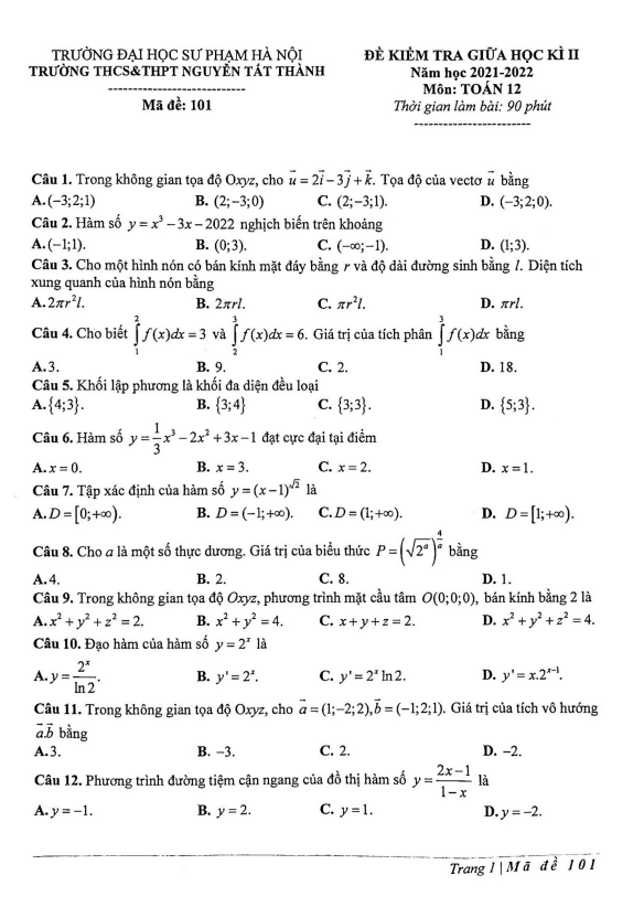 Đề giữa học kì 2 Toán 12 năm 2021 – 2022 trường Nguyễn Tất Thành – Hà Nội