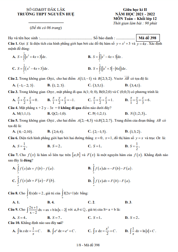 Đề giữa học kì 2 Toán 12 năm 2021 – 2022 trường THPT Nguyễn Huệ – Đắk Lắk