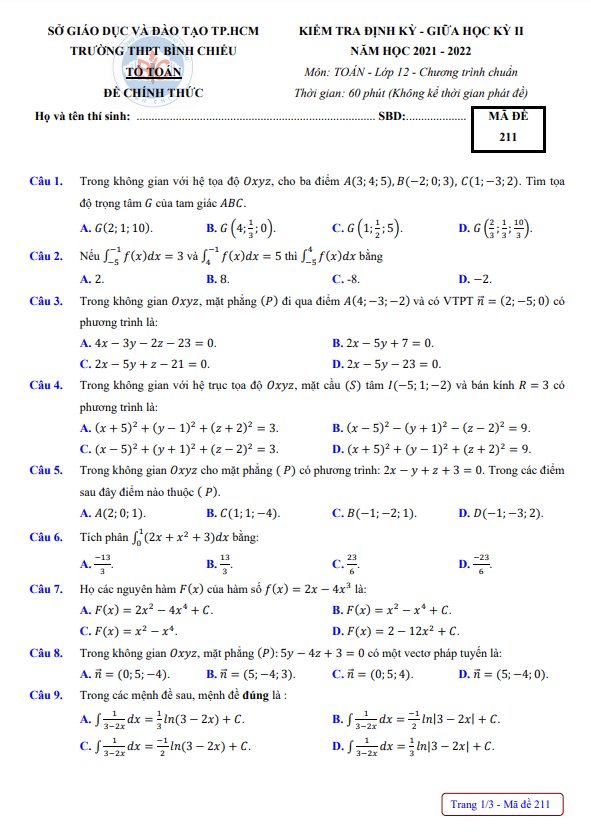 Đề giữa học kỳ 2 Toán 12 năm 2021 – 2022 trường THPT Bình Chiểu – TP HCM