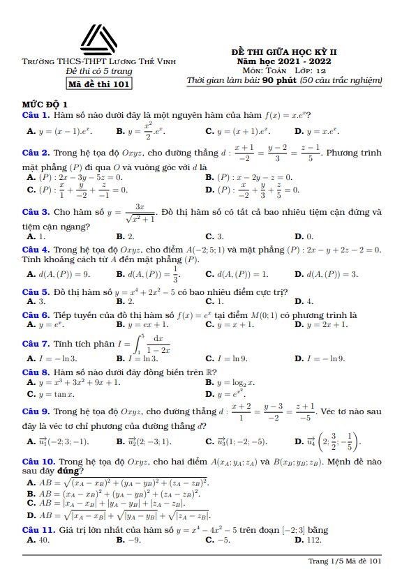 Đề thi giữa học kỳ 2 Toán 12 năm 2021 – 2022 trường Lương Thế Vinh – Hà Nội