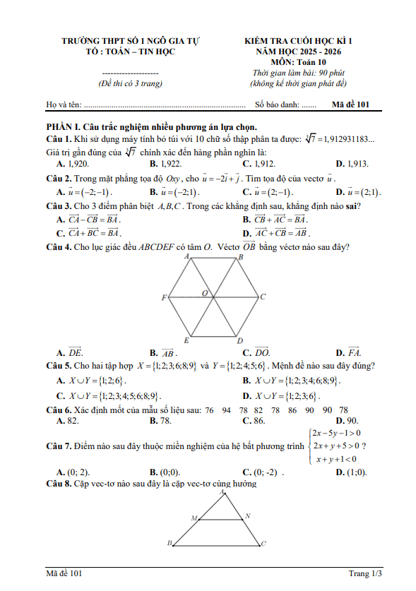 Đề cuối học kì 1 Toán 10 năm 2025 – 2026 trường THPT Ngô Gia Tự 1 – Đắk Lắk