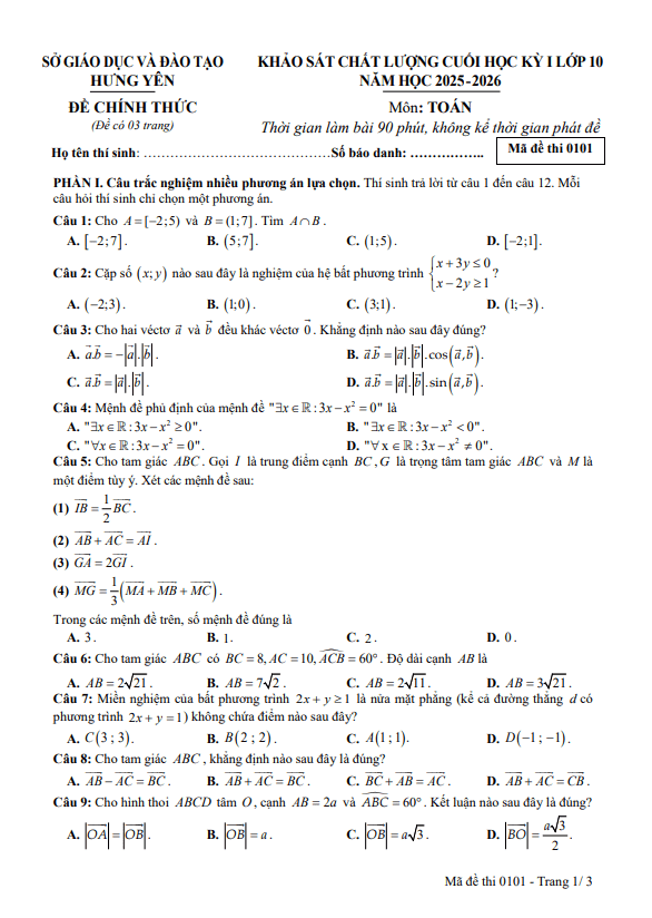 Đề cuối học kỳ 1 Toán 10 năm 2025 – 2026 sở GD&ĐT Hưng Yên