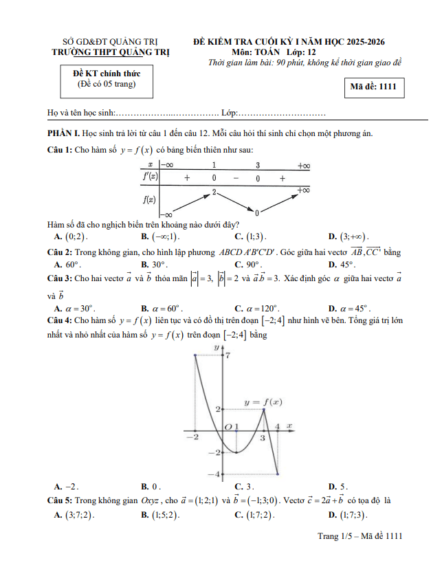 • Đề cuối kỳ 1 Toán 12 năm 2025 – 2026 trường THPT Quảng Trị – Quảng Trị