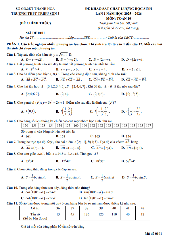 • Đề khảo sát lần 1 Toán 10 năm 2025 – 2026 trường THPT Triệu Sơn 3 – Thanh Hóa