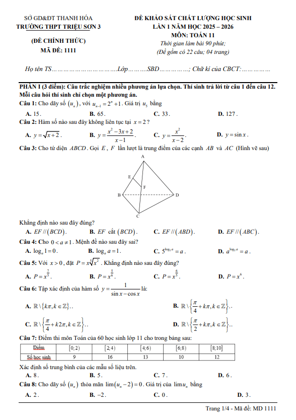 • Đề khảo sát lần 1 Toán 11 năm 2025 – 2026 trường THPT Triệu Sơn 3 – Thanh Hóa