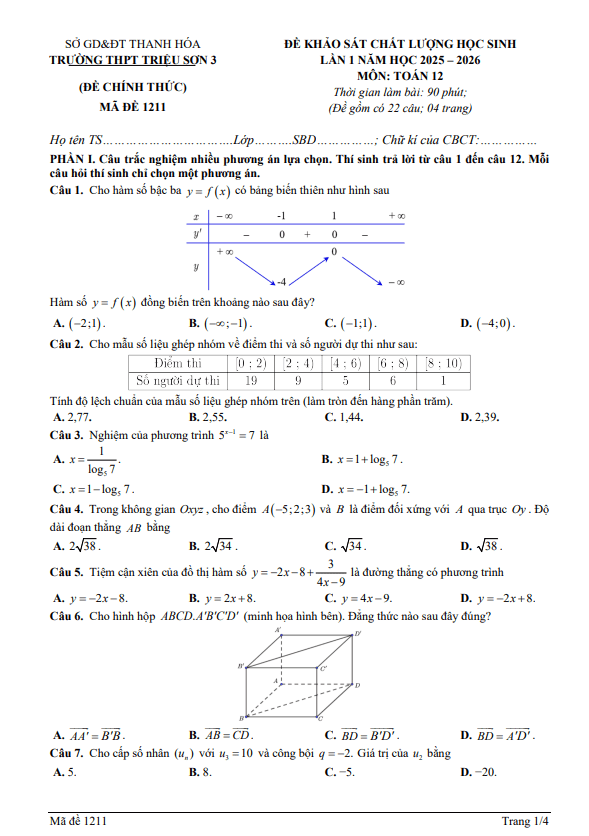 • Đề khảo sát lần 1 Toán 12 năm 2025 – 2026 trường THPT Triệu Sơn 3 – Thanh Hóa